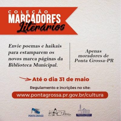 Quer ver seu poema estampando os novos marca páginas da Biblioteca Municipal? Basta enviar seus poemas e haikais até o dia 31 de maio. O regulamento e as inscrições são feitas através do site www.pontagrossa.pr.gov.br/cultura e ficam restritas apenas aos moradores de Ponta Grossa/PR.