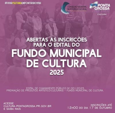 Artistas, produtores, coletivos e agentes culturais de Ponta Grossa já podem inscrever seus projetos no edital do Fundo Municipal de Cultura, lançado pela Fundação Municipal de Cultura e do Conselho Municipal de Política Cultural de Ponta Grossa. O projeto tem como objetivo reconhecer e apoiar iniciativas culturais locais, premiando produtos artístico-culturais em diversas linguagens, como […]