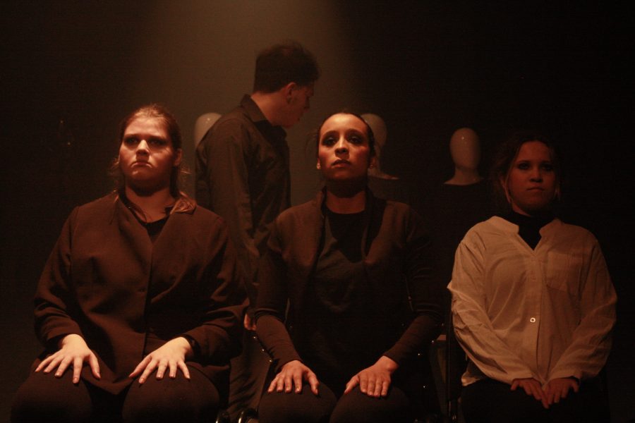 O ator André Victor e as atrizes Beatriz Breus, Gabriela Galdino e Skye Pontes em cena. Foto: Natalia Almeida. Por Natalia Almeida