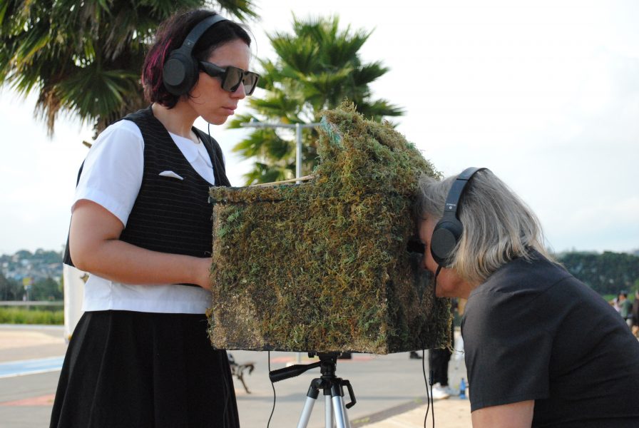 A artista vê o teatro lambe-lambe como um presente para o espectador. “A gente vai até a pessoa, o lambe tem muito isso da curiosidade, porque você vê a parte externa, mas para ver a apresentação você precisa sentar e olhar ali dentro com o fone”.
