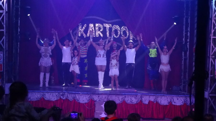 A bailarina aérea Aghata Victoria Kammke, que em sua performance faz brilhar os olhos e arrancar aplausos, conversou conosco após o espetáculo. Há 2 anos trabalhando para o Kartoon, já experiente como bailarina profissional, viu na acrobacia aérea uma oportunidade de inovar em sua arte. “Eu nunca tinha tido essa percepção, mas quando surgiu a oportunidade, topei na hora”, declarou a artista, que se apresenta pendurada em um arco.