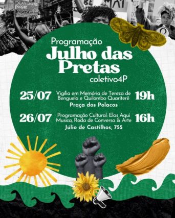 Nesta sexta-feira (25) e sábado (26), o Coletivo 4P promove o Julho das Pretas, com diversas atividades culturais e políticas. O objetivo do evento é referenciar a ancestralidade e as mulheres que resistem à colonização patriarcal. A data engloba o Dia Internacional da Mulher Negra Latino-americana e Caribenha e o Dia Nacional de Tereza de Benguela, ambos comemorados no dia 25 de julho.