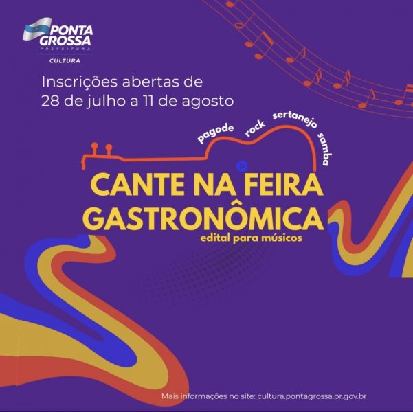A Prefeitura de Ponta Grossa, por meio da Secretaria Municipal de Cultura, publicou o Edital nº 01 de 2025 com o objetivo de selecionar e premiar 20 músicos locais para apresentações na Feira Gastronômica. Serão aceitos artistas dos estilos samba, pagode, rock e suas vertentes, além do sertanejo. Cada selecionado receberá o valor de dois mil reais. As inscrições estão abertas até o dia 11 de agosto de 2025 e devem ser feitas exclusivamente pelo site da Secretaria Municipal de Cultura.