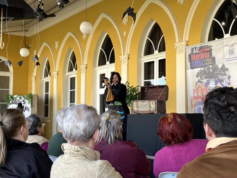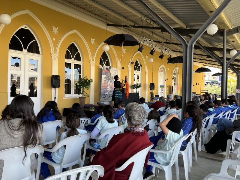 Parte da programação da 44ª Semana Literária do Sesc, a contação de histórias Historibulando, reuniu crianças e adultos na Estação Saudade na última quinta. Patrícia de Sá Maia contou histórias com bonecos e deixou a imaginação do público fluir. As duas sessões, que tiveram duração de 30 minutos, contaram com a presença de duas turmas de escolas municipais. O indiozinho sem nome fez parte do show de bonecos, em que as crianças puderam participar e interagir com os personagens.