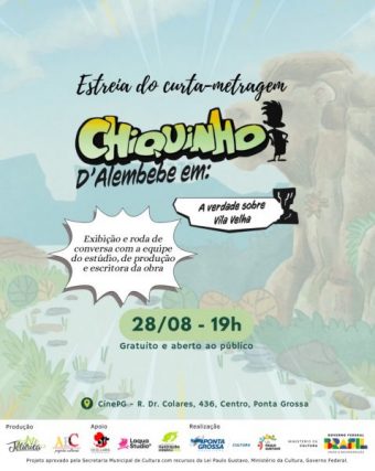 O Cine PG recebe nesta quinta-feira (28/08) a estreia do curta-metragem de animação Chiquinho D’Alembebe em: a verdade sobre Vila Velha, às 19 horas, com entrada gratuita. A produção é assinada pelas editoras ponta-grossenses Arte Telúrica e ABC Projetos Culturais, e marca a chegada do personagem criado pela escritora Marivete Souta às telas.