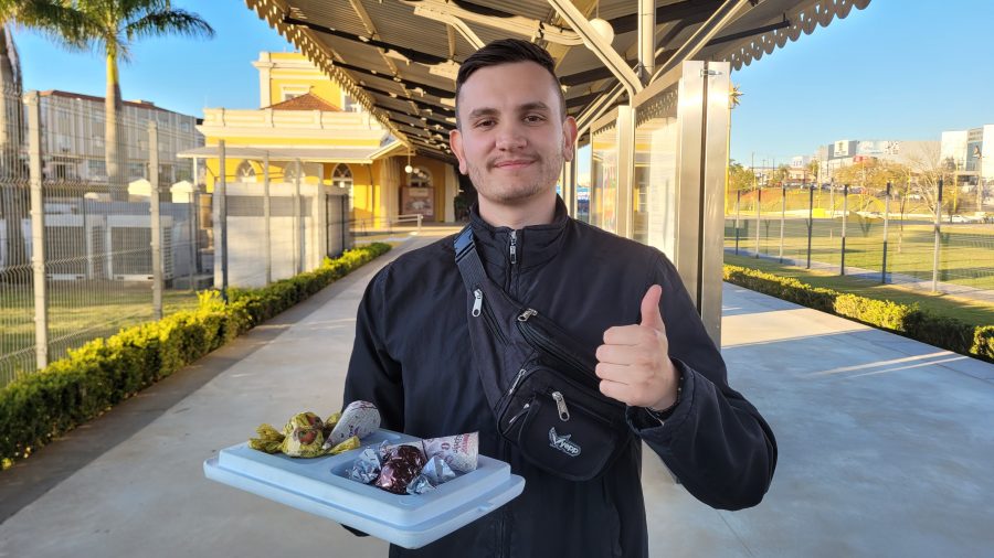 O paulista de 26 anos e natural de Águas de Lindóia – cidade localizada no interior do estado de São Paulo e próxima a Minas Gerais, com cerca de 18 mil habitantes – conta que vive em Ponta Grossa há cerca de dois meses na trajetória da venda de trufas. Após trabalhar com hotelaria em São Paulo, Eduardo chegou na cidade e começou como recepcionista do Barbur Plaza Hotel por alguns meses, antes de se dedicar completamente às vendas, que, hoje, são seu sustento de forma integral. Deduzi que seu antigo emprego tenha ajudado na desenvoltura com as pessoas, e obtive a confirmação por parte dele. “Acredito que de fato aquele trabalho ajudou no meu desenvolvimento, devido às experiências inéditas que eu tive em contato com o público”, comenta.