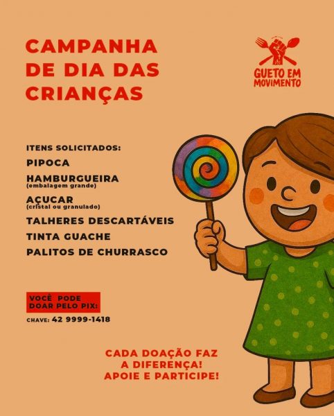 No próximo 12 de outubro, a comunidade Eric Johnson Duarte, em Ponta Grossa, vai ganhar um dia de festa, música e solidariedade com o evento do “Gueto e Movimento”, uma ação social que mistura cultura, hip-hop e solidariedade para celebrar o Dia das Crianças. Idealizado por Rui Adriano Leiria de Sá, o Mano Polako, o projeto busca promover um dia de alegria para as crianças do local e, ao mesmo tempo, fortalecer o trabalho social desenvolvido pelo movimento.