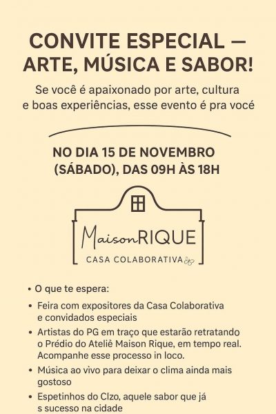 A Maison Rique Casa Colaborativa promove neste sábado, 15 de novembro, um encontro especial que une arte, música e sabor, das 9h às 18h, em Ponta Grossa. O evento promete reunir expositores locais, artistas, artesãos e apreciadores da cultura, com entrada gratuita.