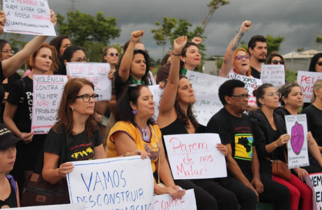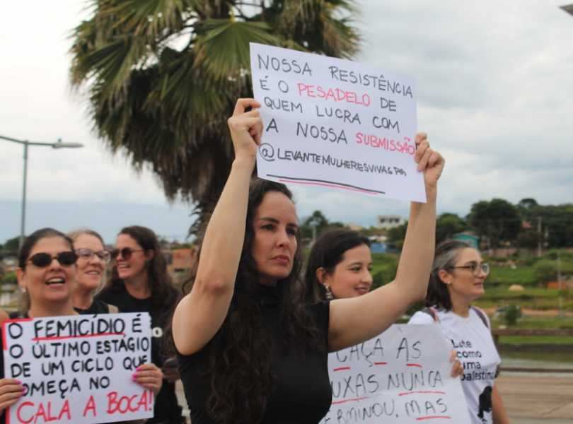 Após as falas, as participantes realizaram uma breve caminhada no lago com gritos de protesto. Durante o percurso, manifestantes carregavam cartazes com mensagens como “Parem de nos matar” e “Pela vida das mulheres”.
