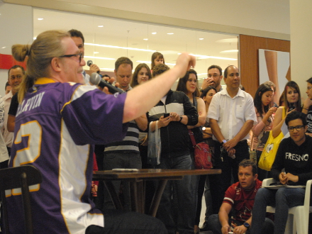 Gessinger conversa com multidão reunida na frente da livraria (Amauri Barbosa)Com uma camisa de futebol americano, óculos redondos, um coque no cabelo e dois novos lançamentos, Humberto Gessinger esteve em Ponta Grossa no dia 11 de setembro.