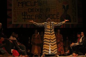 Lente Quente/Juliana KrolProduzido pela Companhia Transitória, de Curitiba, a peça “Macumba: Uma Gira sobre Poder” trouxe ao Festival Nacional de Teatro, na noite de ontem (10), provocações para o público ao tratar de questões raciais voltadas ao negro. Para quebrar tabus e preconceitos, de acordo com Thiago Inácio, ator e produtor, o espetáculo utilizou de uma grande característica do teatro negro: não separar o teatro da música e da dança. Os atores, utilizando as próprias vivências em suas peles e os preconceitos que sofrem, buscaram promover uma reflexão através da linguagem autoral do teatro negro.
