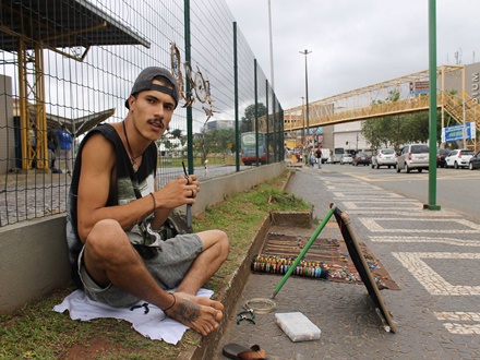“Aqui [ao lado do Terminal Central] a gente não tem problema. Foram nos tirando de lá e de cá. ‘Aqui não pode, ali não pode, tal, tal, tal… fiquem ali!’ Nos deixaram aqui, não tem um alvará, mas a própria fiscalização da administração municipal nos permitiu ficar aqui”, comenta Azevedo sobre o local de trabalho. Segundo ele, os artesãos de rua sempre ficam à margem, no escanteio, mesmo gerando renda no município. Ele protesta que assim surge a marginalização. “A gente por estar na rua é marginalizado o tempo todo. Não há um espaço legal pra trabalhar, a gente poderia estar trabalhando mais ao centro, próximo do comércio, da população”.