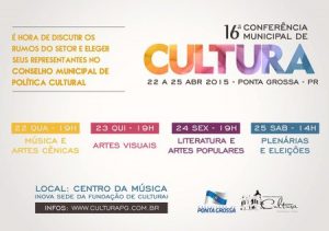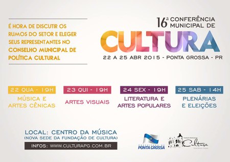 Cartaz de divulgação do eventoCom o intuito promover a participação do setor cultural na cidade, a 16ª edição da Conferência Municipal de Cultura ocorreu no fim deste mês, com duração de quatro dias. Setores como Música, Artes Cênicas, Artes Visuais, Literatura e Artes Populares receberam novas indicações e sugestões para as demandas de Ponta Grossa. Além de construir debates, o ultimo dia do evento contou com uma plenária e eleição de novos representantes.