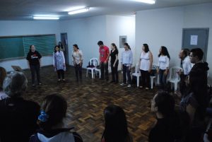 Trabalhar com o corpo para emitir sons. Esse foi o objetivo da prática artística “Percussão Corporal”, realizada no Conservatório Artístico Musical Maestro Paulino Martins Alves. O evento ocorreu quarta-feira, dia 11, e foi coordenado pela professora de música Carla Roggenkamp durante os períodos da tarde e noite. Pessoas de diversas idades e de ambos os sexos participaram dos exercícios de aquecimento e relaxamento.