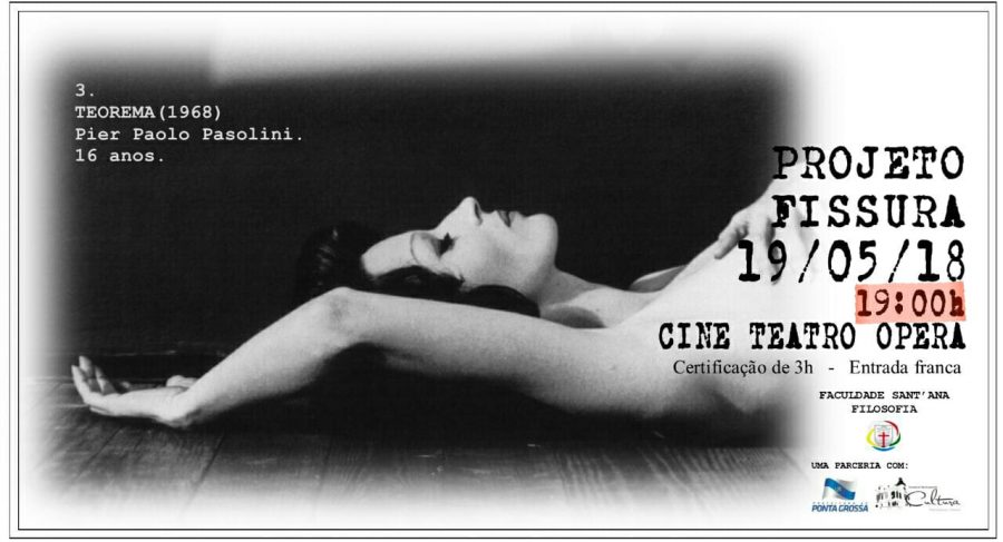 Foto: divulgação“O Teorema” (1968), do consagrado diretor italiano Pier Paolo Pasolini, foi exibido na noite deste sábado (19) no palco B do Cine Teatro Ópera, na terceira edição do Projeto Fissura neste ano. Em parceria com a Fundação Municipal de Cultura de Ponta Grossa, o curso de Filosofia da Faculdade Sant’Ana promove o Fissura há quatro anos com o objetivo de exibir filmes e promover o debate sobre as produções.
