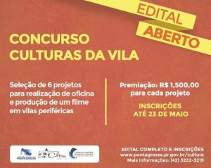 O projeto “Culturas da Vila” é o primeiro edital cultural lançado em 2018 e deve selecionar ofertas de oficinas de vídeo comunitário nos bairros da cidade. O edital prevê a entrega de seis prêmios de R$ 1.500,00 para execução de cada proposta aprovada. O segundo edital, que também encerra inscrição na quarta, 23/05, é da mostra “Campos Visuais”, que busca exibir produções audiovisuais locais sobre a cultura paranaense. A premiação do edital é de R$ 3.500,00 para cada proposta selecionada, que deve ter 10 exibições e ummínimo de cinco produções distintas.