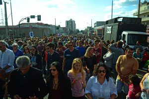 Foto: Cássio MuriloCerca de 38 mil fiéis foram às ruas na última quinta feira (31) para a procissão de Corpus Christi em Ponta Grossa. A festa católica celebra o sacramento da Eucaristia com missa e o característico tapete montado nas ruas pelas paróquias locais. A procissão teve início às 14h30 em frente ao Asilo São Vicente de Paulo, seguiu pela Avenida Balduíno Taques, virou à esquerda na Vicente Machado e mais à frente entrou na Benjamin Constant até a esquina com a Rua Marechal Deodoro da Fonseca, onde um altar foi montado para receber o ostensório com a hóstia consagrada, carregado pelo bispo da Diocese de Ponta Grossa, Dom Sérgio Arthur.