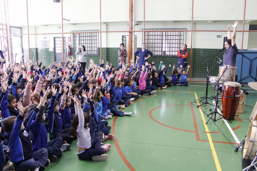 Em 21 de setembro, o projeto Concertos Percussivos nas Escolas foi apresentado aos alunos da Escola Professor Plácido Cardón, no bairro Ronda. Esse tipo de iniciativa causa um impacto positivo na vida escolar das crianças.Na apresentação do projeto o músico Ricardo Correa demonstra para as crianças o ritmo com bater de palmas, depois de explicar os instrumentos, ele toca e as crianças acompanham com palmas e cantando o nome daquele estilo musical.|Foto: Veridiane Parize / Lente Quente