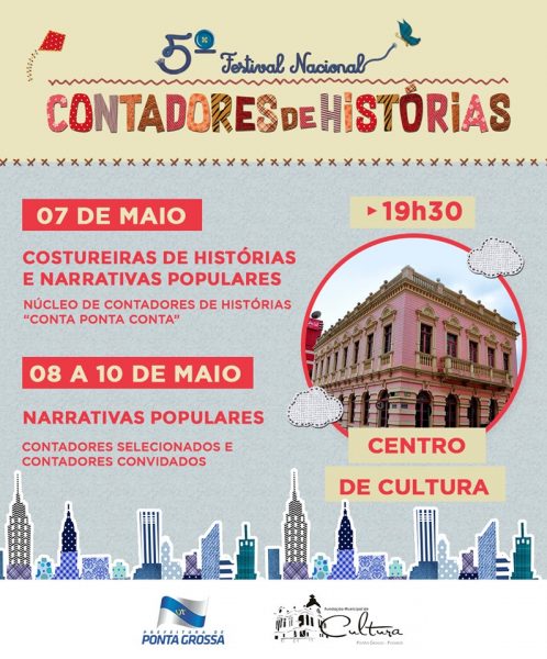 Foto: DivulgaçãoO 5º Festival Nacional de Contadores de História teve início hoje com a apresentação “Costureiras de Histórias e Narrativas Populares”, organizado pela Fundação Municipal de Cultura. O Festival ocorre entre os dias 07 e 10 de maio e este ano a temática do evento é “Poéticas Urbanas: tecendo afetos, costurando memórias”. Serão 30 profissionais realizando esta maratona de contação de história, além de ministrarem oficinais, palestras, falas interativas e atividades didáticas. Segundo a Prefeitura, o evento conta com artistas do estado de Santa Catarina, Minas Gerais, Roraima, Paraná, Ceará, Pernambuco, Alagoas, São Paulo, Rio Grande do Sul, Rio de Janeiro, Bahia e Distrito Federal. Mais informações e a programação completa podem ser vistas no site da prefeitura clicando aqui.