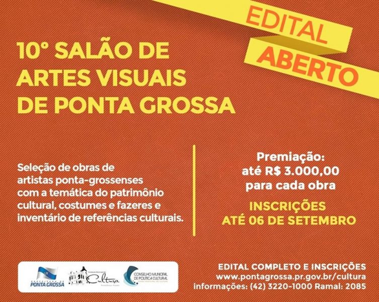 O edital 020/2019 proposto pelo Conselho Municipal de Política Cultural e pela Fundação Municipal de Cultura, promove a realização do 10º Salão de Artes Visuais. Este ano o evento será realizado na Galeria João Pilarski no Centro de Cultura no dia 05 de outubro, às 19h30 ,aberta à visitação até o dia 31 de outubro. As inscrições devem ser protocoladas no Protocolo Geral da Prefeitura endereçada à Fundação Municipal de Cultura no Departamento de Cultura. Cada participante pode inscrever até 3 obras.