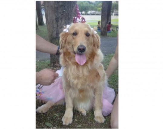Aisha, da raça Golden Retriever, de 7 anos, estava vestida para o concurso. | Foto: Jessica GrossiNo último domingo (1), das 15 às 19 horas, o parque Monteiro Lobato se tornou o ponto de encontro de vários cães e seus donos. A praça, que já era conhecida por ser um local agradável para passear com os pets, ficou repleta de animais. Alguns chegaram a levar gatos para passear.