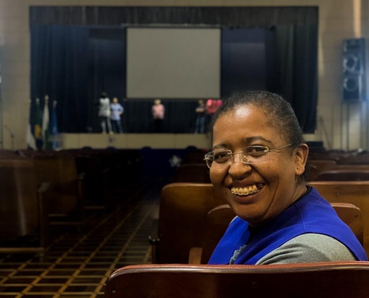 Roseli Vaz de Almeida no auditório central da Universidade Estadual de Ponta Grossa (UEPG) | Foto: Matheus RolimSubindo a escada externa, no pátio da Universidade Estadual de Ponta Grossa (UEPG), que dá direto à porta lateral do auditório central, deparo com o salão vazio, acontecimento inusitado para quem não é funcionário ou da organização de eventos. As luzes estavam apagadas, exceto por um cômodo pequeno, a Copa, onde é preparado o café dos servidores que trabalham no bloco A. Faltavam 15 minutos. Logo, às 11h30, a famosa tia da limpeza da UEPG chegaria para uma conversa informal. Ali mesmo, nos bancos almofadados de madeira escura, um ao lado do outro, Roseli Vaz de Almeida, 51 anos, mulher, negra, graduada em Letras, mestranda em Estudos da Linguagem e funcionária da Universidade iria conceder o horário de almoço para uma conversa sobre a vida. O que é a vida?