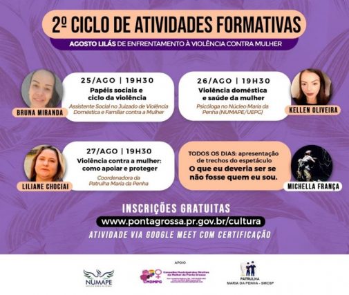Programação do evento | Foto: Divulgação/Fundação Municipal de CulturaInicia nesta terça-feira (25), o 2º Ciclo de Atividades Formativas da Fundação Municipal de Cultura de Ponta Grossa. O tema desta edição é o Agosto Lilás, mês de conscientização sobre a violência contra as mulheres. O mês marca também a criação da Lei Maria da Penha, em 2006. A legislação visa a proteção de mulheres da violência doméstica e familiar. Confira a programação: