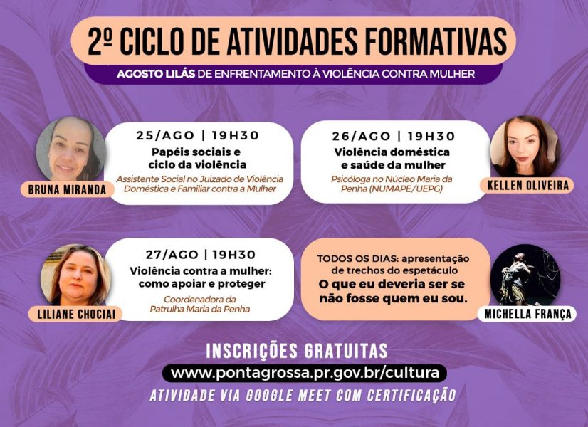 No mês de enfrentamento à violência contra a mulher, conhecido como Agosto lilás, a Fundação Municipal de Cultura de Ponta Grossa promove o 2º Ciclo de Atividades Formativas, com palestras e atividades culturais. O evento teve início nesta terça-feira, 25, e a programação segue com atividades nesta quarta e quinta-feira, às 19h30, via Google Meet.