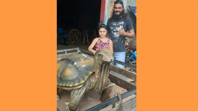 Mérison Pinheiro ao lado da filha Anny e da escultura de jabuti. Foto: Arquivo PessoalUma escultura de jabuti, feita pelo artista plástico Mérison Pinheiro, foi retirada do Parque de Olarias pela Prefeitura de Ponta Grossa no início do mês de fevereiro. Por não conter uma licença para instalação em áreas públicas, a obra teve de ser removida do local. A escultura, que carrega um significado importante a Mérison, busca representar todos os artistas da região dos Campos Gerais.