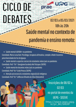 No dia 2 de março teve início o Ciclo de Debates que aborda saúde mental no contexto da pandemia e ensino remoto, promovido pela UEPG. São quatro dias de encontros via Google Meet. No primeiro dia, a psicóloga e terapeuta afirmativa que compõe a Rede Encontros pela Diversidade de Foz do Iguaçu, Maria Luisa Burt, foi convidada a falar sobre a saúde mental da comunidade LGBTQIA+ na pandemia. O encontro foi mediado pelo estudante de Pedagogia na UEPG, Guilherme Portela.