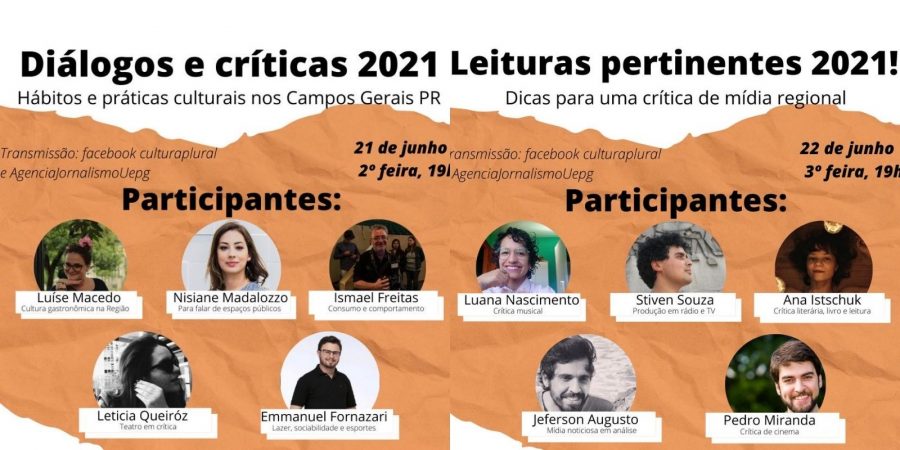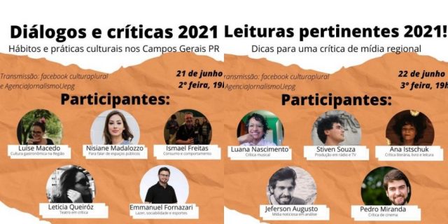 O evento, coordenado pelo professor Sérgio Gadini e organizado em parceria com a Agência de Jornalismo, o Cultura Plural e o Mestrado em Jornalismo da Universidade Estadual de Ponta Grossa (UEPG) será transmitido ao vivo pela fanpage do Cultura Plural e da Agência de Jornalismo UEPG. “As práticas culturais e as ações de mídia estão cada vez mais integradas, seja por interação, consumo ou experiência, na era da informação digital”, explica Sérgio Gadini, professor de Crítica de Mídia do Curso de Jornalismo. “O exercício da crítica implica um conhecimento prévio, que se adquire com leitura, diálogo e ouvindo profissionais que conhecem os diversos segmentos do campo cultural e da mídia”, completa.