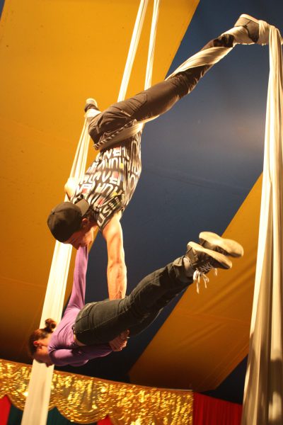 Tecido duplo é um dos números que serão apresentados. Foto: Jaqueline AlbanoO Espaço Chic Chic, no SESC de Ponta Grossa, recebe na noite deste sábado, 10, a formatura dos alunos de práticas circenses. O espetáculo Revelações apresenta números de trapézio, lira, tecido duplo, mágica, malabarismo, monociclo, perna-de-pau e palhaços. As aulas foram oferecidas gratuitamente em uma parceria entre a Secretaria Municipal de Cultura e Turismo (SMCT) e o SESC local, e ministradas por integrantes da trupe Família Salgueiro, desde junho deste ano para uma turma de 12 alunos.