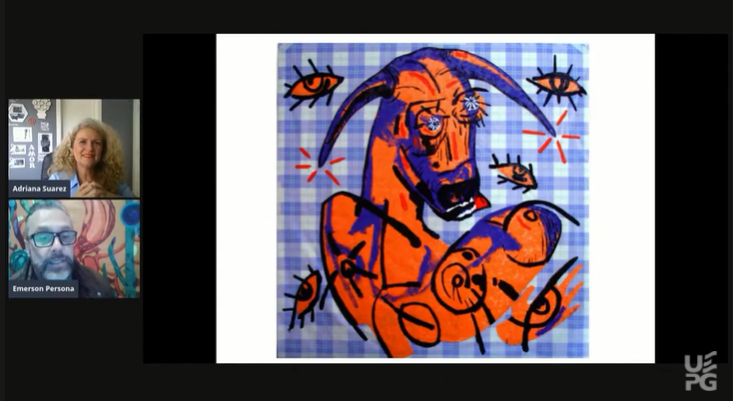 Descrição da Imagem: Captura de tela da abertura da exposição. Na tela aparecem Emerson Persona e Adriana Suarez. Do lado direito há uma apresentação de uma obra de Emerson Persona.