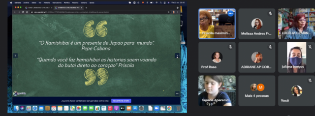 Priscila também leu um trecho do seu livro em espanhol para o público e compartilhou suas experiências com o Kamishibai, um método milenar japonês de contação de histórias, voltado especialmente para crianças. O Kamishibai significa teatro de papel e possui relação com as tradições budistas de séculos atrás. Quando foi reintroduzido à cultura japonesa, durante o período entre guerras, rendeu muitos empregos para contadores de histórias ambulantes, produtores das estruturas de Kamishibai e ilustradores dos bonecos e paisagens que compunham os teatros de papel. O Kamishibai também foi utilizado para doutrinar o povo japonês a ir à guerra, o que ocasionou, por décadas, uma associação mal vista à prática de contação de histórias por meio dos teatros de papel. Somente no começo dos anos 2000 ele foi resgatado para ser usado como é até os dias atuais: de forma pedagógica.