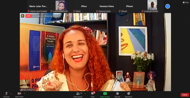 Dani Pamplona, autora de "O Poder da Palavra Falada' durante roda de conversa sobre o livro. / Foto: print de tela.Na última terça-feira, 07, uma roda de conversa sobre o livro “O Poder da Palavra Falada”, da autora Dani Pamplona, aconteceu por meio da plataforma Zoom e com transmissãopelo YouTube. Das 19h30 até às 22h30, o encontro online reuniu contadores de histórias de todos os cantos do Brasil, que fizeram falas sobre a importância da contação. Representando Ponta Grossa, a contadora de histórias Lucélia Clarindo, do Bando da Leitura, foi uma das convidadas para a roda de conversa e trouxe um pouco da sua visão para o diálogo.