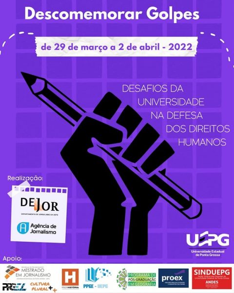 31/03/2022 – 20h (atividade remota): Registrar desrespeitos e denunciar agressões em defesa das lutas coletivas. Painelistas: Aluízio Palmar (Centro de DHs Foz do Iguaçu), Miliandre Garcia (UNESPAR), Regis Clemente Da Costa (UFFS). Mediação: Sérgio Gadini