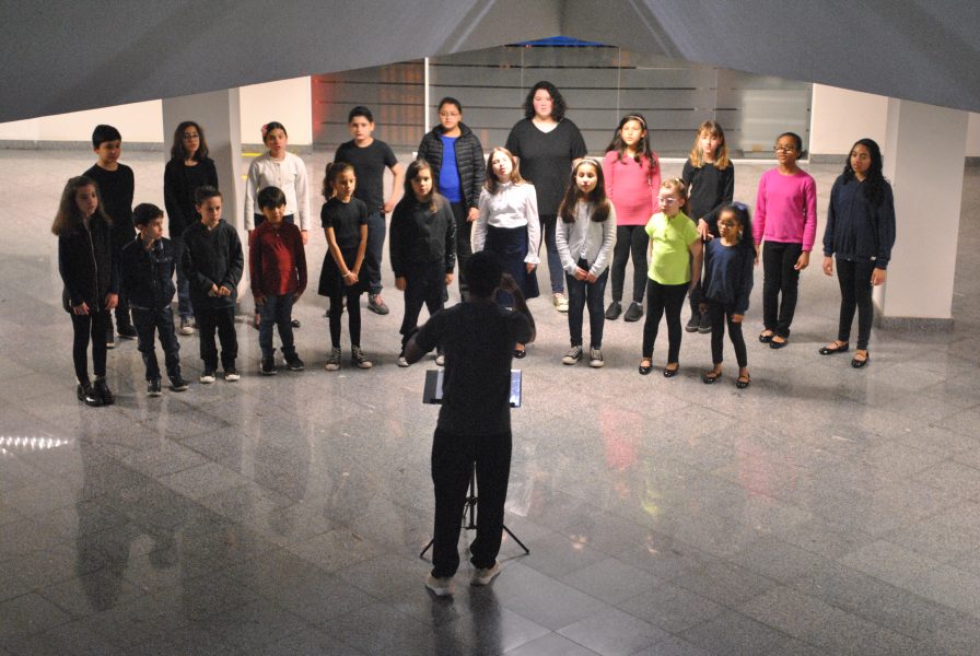 Coral Infanto Juvenil Tons e Cores | Foto: Joyce ClaroNa segunda-feira, 17, o Coro Infantojuvenil Tons e Cores realizou a apresentação Sonoridades Brasileiras no hall do prédio da reitoria da Universidade Estadual de Ponta Grossa. Canções como Se essa rua fosse minha, de Mário Lago e Roberto Martins,e Leãozinho, de Caetano Veloso, compuseram o repertório. Em seguida, o coral expôs a proposta das próximas canções, que consistia em quatro músicas cantadas em continuidade: Dona Maria, Laranja Doce, Doura o cacho do cabelo dela e Eu não vim.