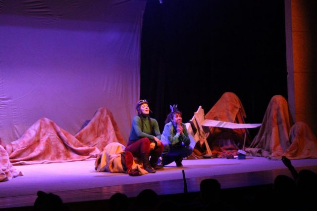 As atrizes Helena de Jorge Paulino e Catherine Moreira no palco do Teatro Marista. Foto: Maria Luiza Pontaldi