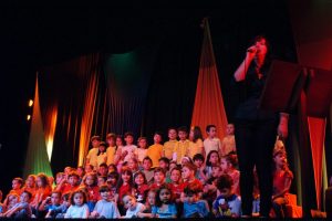 Comandados pela professora Silvana, o Coral se apresenta. Foto de: Keren BonfimBurburinho de vozes, correria nos corredores do teatro e um público animado. No palco, o colorido da decoração e os arranjos demonstram que os artistas da noite, dessa vez, são outros. Sentados, em pé, acenando para os pais que estão na plateia, batendo palmas, as crianças do Coral Estrelinhas Sonoras, do Serviço Social do Comércio (Sesc), ocupam o cenário do Cine-Teatro Ópera. A apresentação ocorreu na sexta-feira, 19, a partir das 19h30.