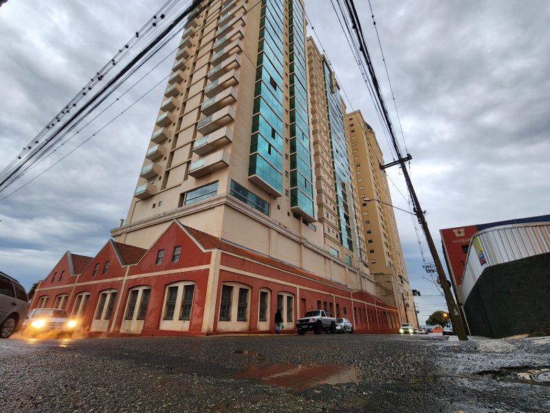 Edifício Torre Brasil tem incorporado a sua estrutura a fachada da antiga escola dos ferroviários de Ponta Grossa | Foto: Leonardo Duarte